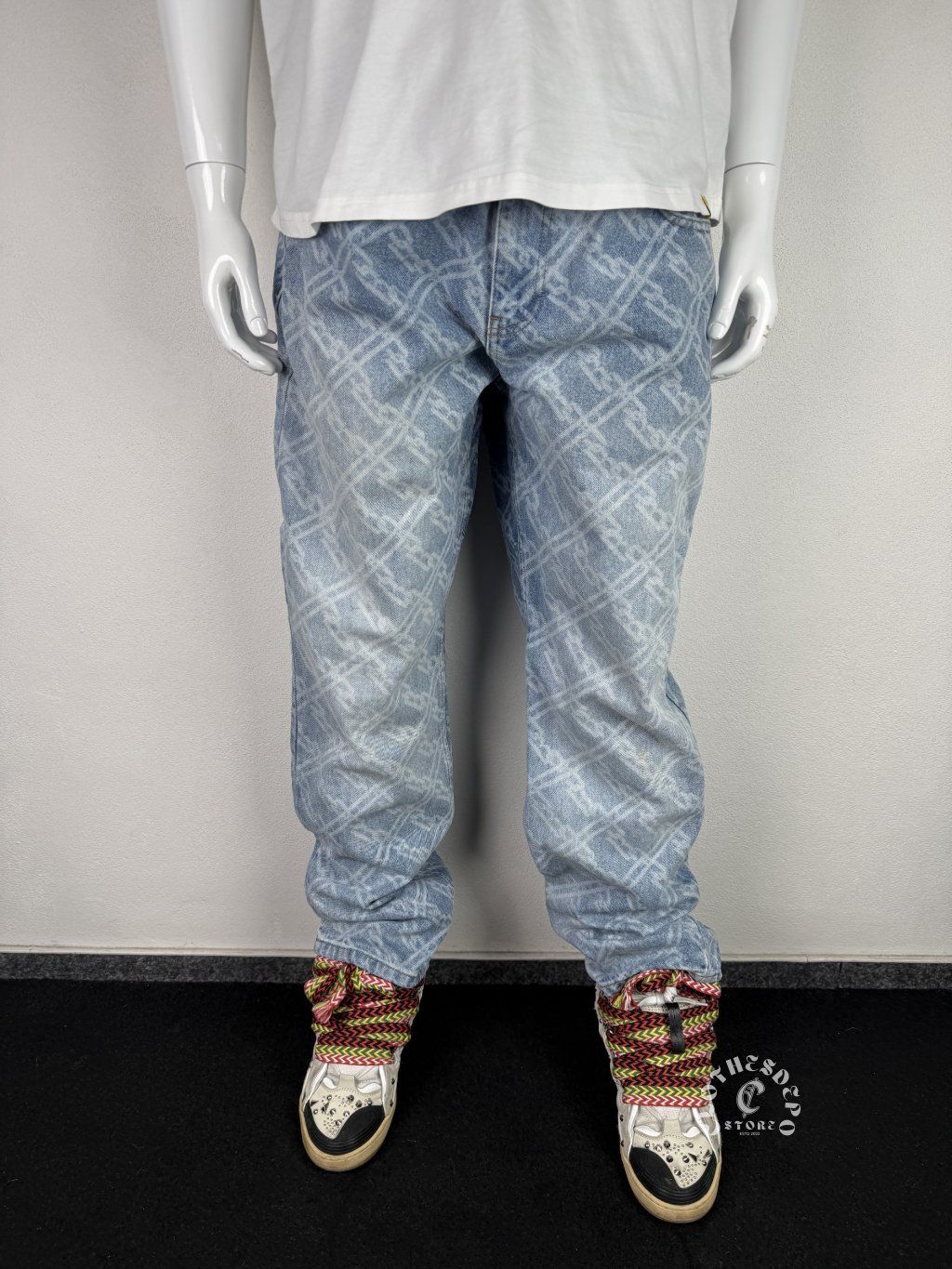 Štýlové denimové nohavice značky A3B v svetlomodrom odtieni s výrazným all-over vzorom, ktorý dodáva kúsku unikátny streetwear vibe. Nohavice majú voľnejší strih (relaxed fit), čo zabezpečuje pohodlné nosenie a moderný look ideálny na každodenné outfity.