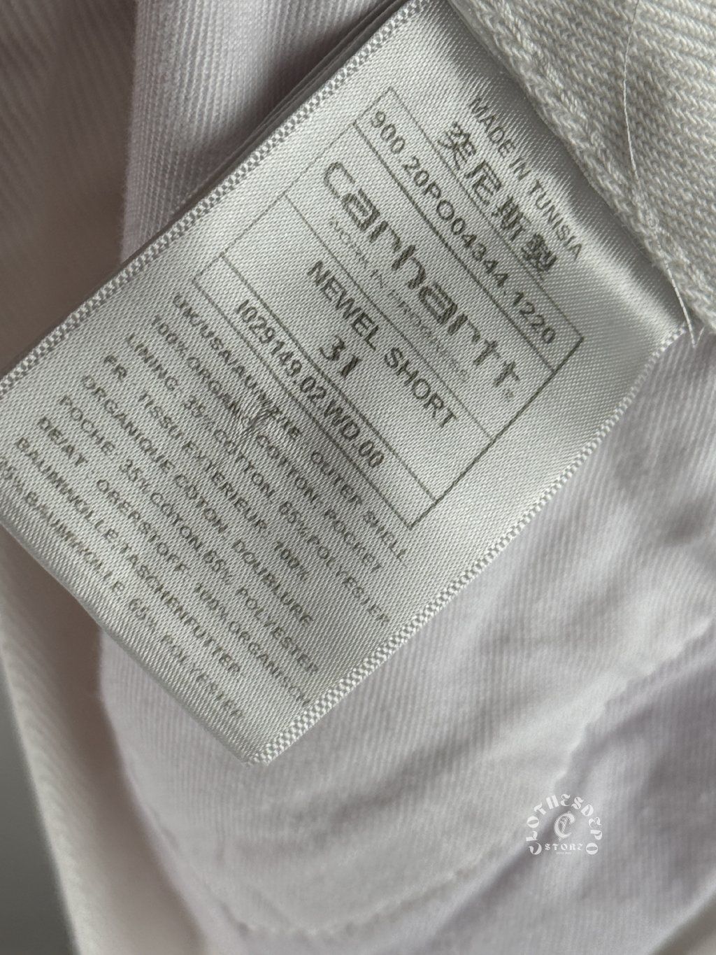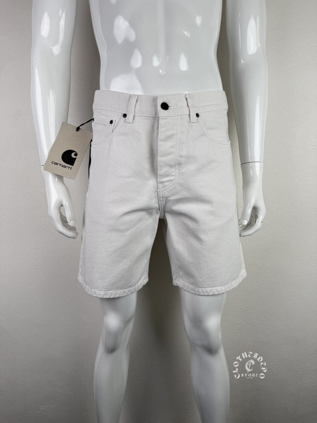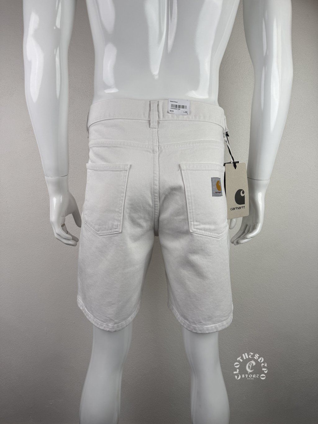 Prémiové biele rifľové kraťasy od značky Carhartt, ktoré spájajú čistý minimalistický dizajn s ikonickou kvalitou tejto streetwear/workwear značky.