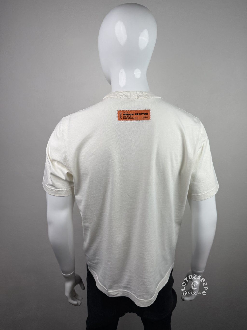 Originálne pánske tričko Heron Preston v elegantnej krémovej (off-white) farbe patrí medzi ikonické kúsky tejto luxusnej streetwear značky. Značku založil americký dizajnér Heron Preston a preslávila sa kombináciou moderného streetwearu, umeleckých grafík a výrazných detailov, ako sú typické oranžové labely.