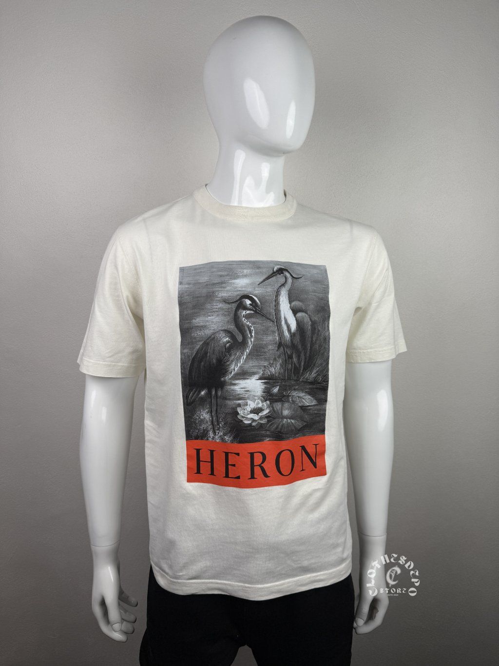 Na prednej strane trička sa nachádza výrazná grafická potlač s motívom volaviek (herons), ktorá odkazuje na názov značky. Spodná časť grafiky obsahuje červený panel s nápisom HERON, ktorý vytvára kontrast s čiernobielym umeleckým motívom a dodáva tričku výrazný streetwear charakter.