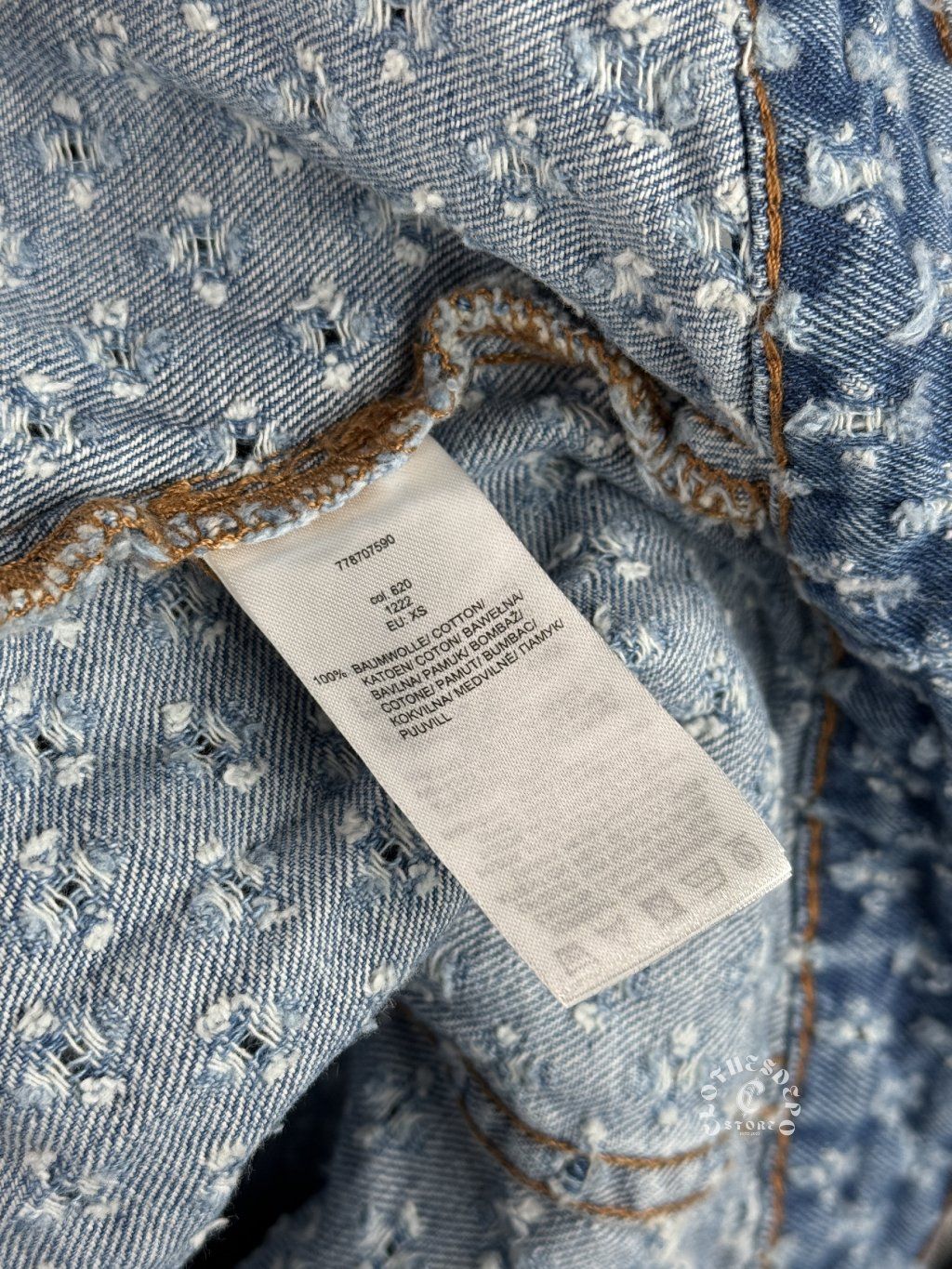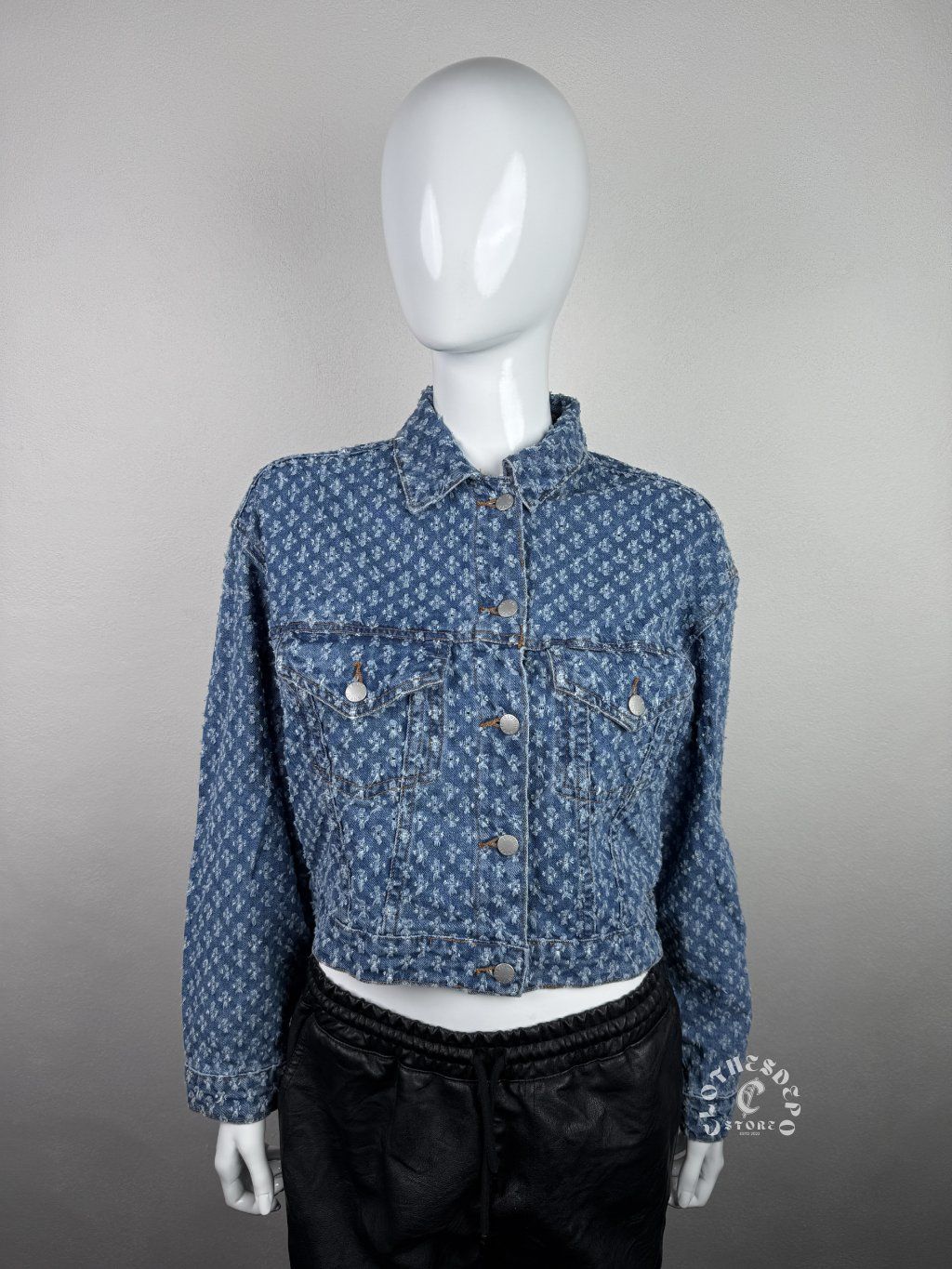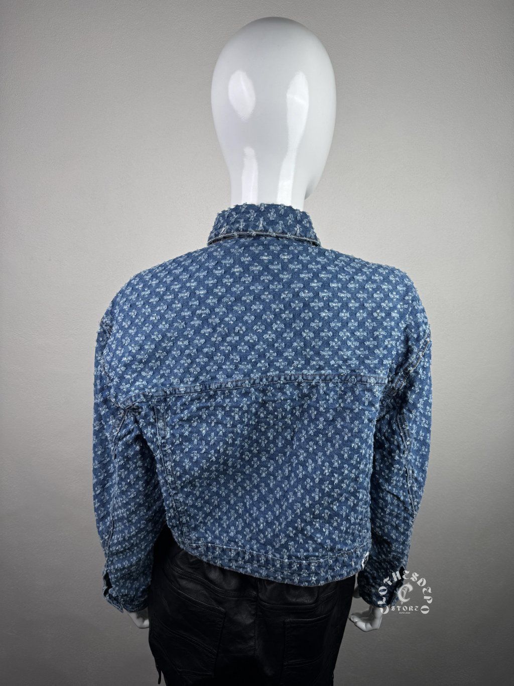 Bunda je vyrobená zo 100 % bavlnenej rifľoviny, ktorá je pevná, odolná a zároveň pohodlná na každodenné nosenie. Materiál má jemnú štruktúru s drobnom kvetinovom / bodkovanom vzore, ktorý dodáva klasickej denim bunde zaujímavý a originálny vzhľad.