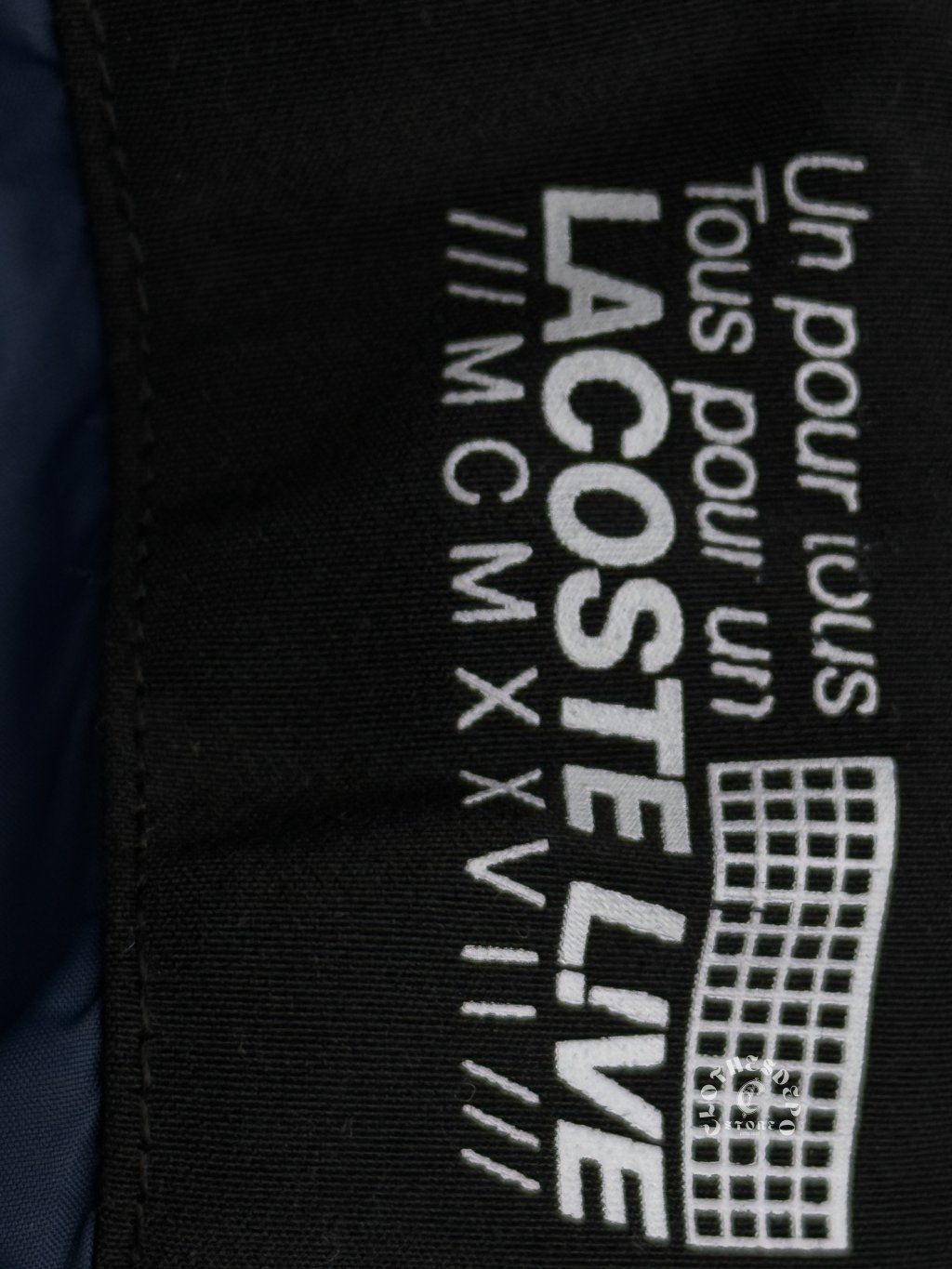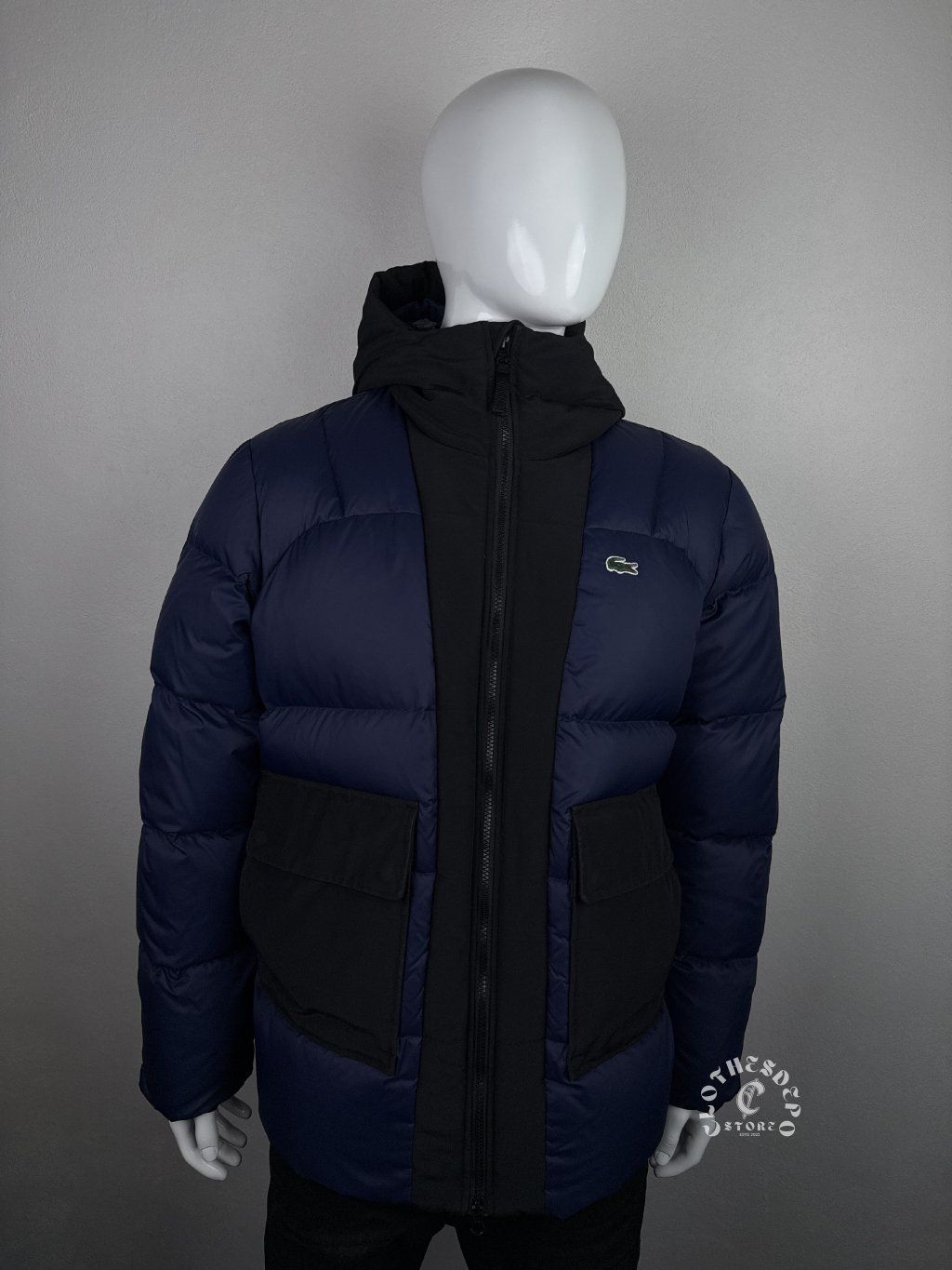 Bunda je vyhotovená v kombinácii tmavomodrej (navy) a čiernej farby, ktorá pôsobí veľmi moderným a univerzálnym dojmom. Na hrudi sa nachádza ikonické Lacoste krokodílie logo, ktoré je symbolom kvality a francúzskeho dizajnu.