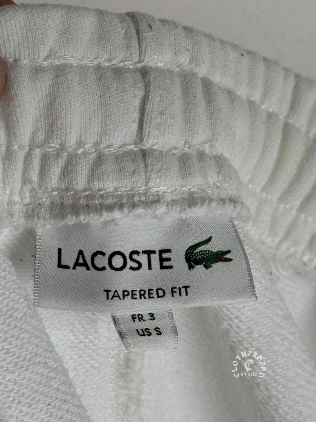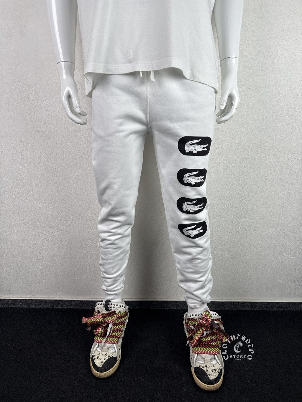 Štýlové tepláky značky Lacoste v čistej bielej farbe, ktoré vynikajú minimalistickým, ale zároveň výrazným dizajnom. Na nohavici sa nachádza ikonická séria krokodílov, ktorá dodáva unikátny a okamžite rozpoznateľný look.