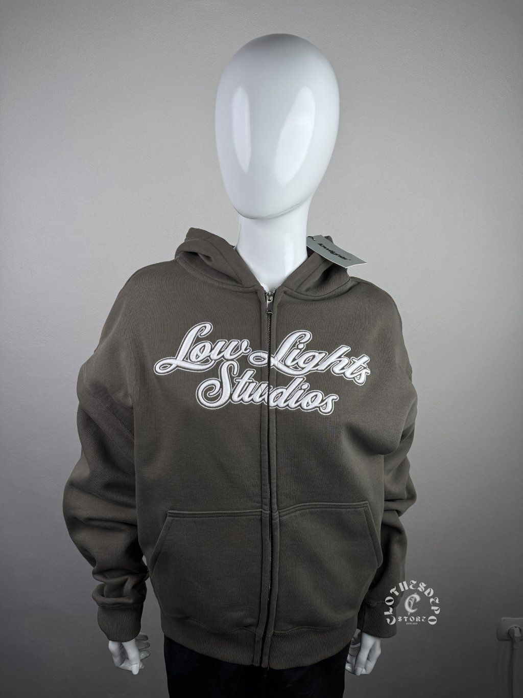 Štýlová Low Lights Studios zip-up hoodie v taupe (hnedo-sivej) farbe s výrazným script logom “Low Lights Studios”na hrudi. Mikina má moderný streetwear vzhľad, voľnejší strih a zapínanie na celý zips, vďaka čomu je praktická na vrstvenie počas celého roka.