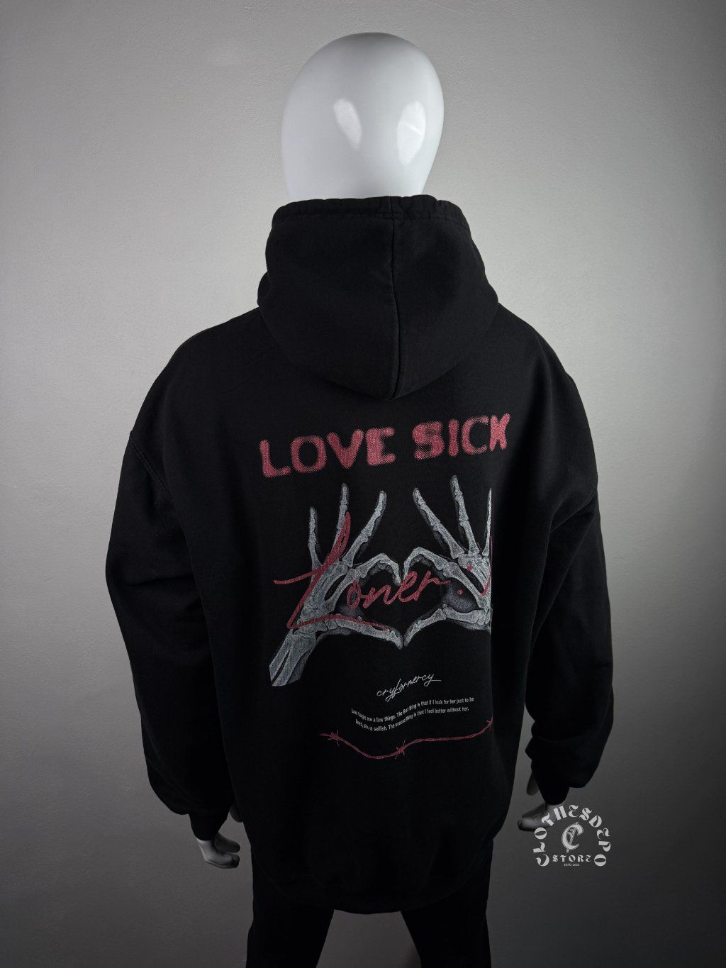Na zadnej strane sa nachádza väčšia ilustrácia, ktorá tvorí hlavný dizajnový prvok mikiny. Grafika zobrazuje kostrové ruky vytvárajúce tvar srdca, doplnené výrazným textom “Love Sick Lover”. Dizajn pôsobí temnejšie, no zároveň romanticky, čo je charakteristický štýl značky Cry for Mercy.