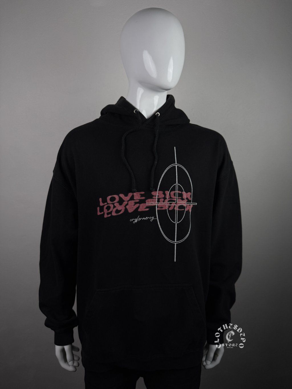 Mikina má klasický hoodie strih s kapucňou a klokankovým vreckom, ktorý poskytuje pohodlie a praktickosť pri každodennom nosení. Predná časť obsahuje grafiku s nápisom „Love Sick Lover“ v červenej farbe doplnenú o minimalistický geometrický motív pripomínajúci zameriavací kruh. Tento kontrast vytvára moderný a mierne dystopický vizuál.