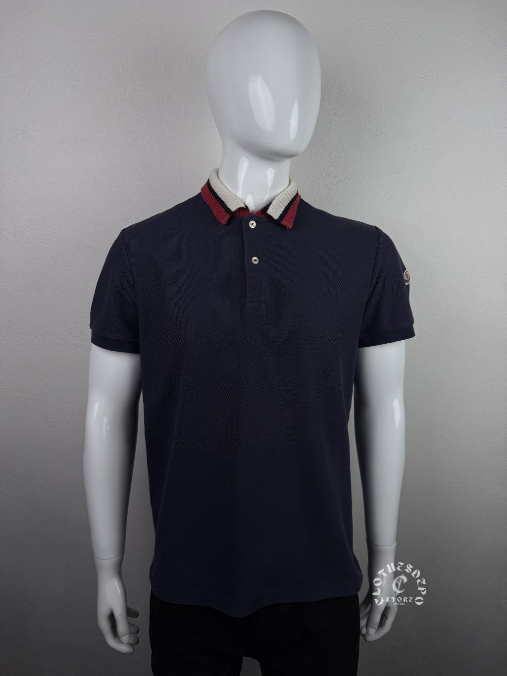 Prémiové polo tričko od luxusnej značky Moncler v tmavomodrej farbe. Čistý a nadčasový dizajn dopĺňa kontrastný golier v červeno-bielom prevedení a ikonické logo na rukáve, ktoré dodáva kúsku typický luxury charakter.