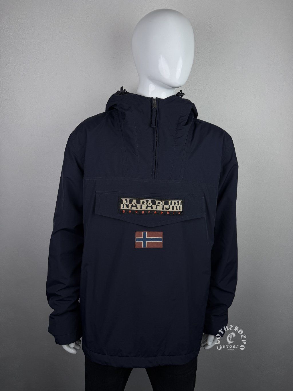 Bunda má praktický anorakový strih s polovičným zipsom, ktorý poskytuje ochranu pred vetrom a chladom. Dominantným prvkom je veľké predné vrecko s klopou, doplnené ikonickým logom Napapijri Geographic a charakteristickou nórskou vlajkou, ktorá je symbolom značky. Tento detail dodáva bunde autentický outdoorový charakter.