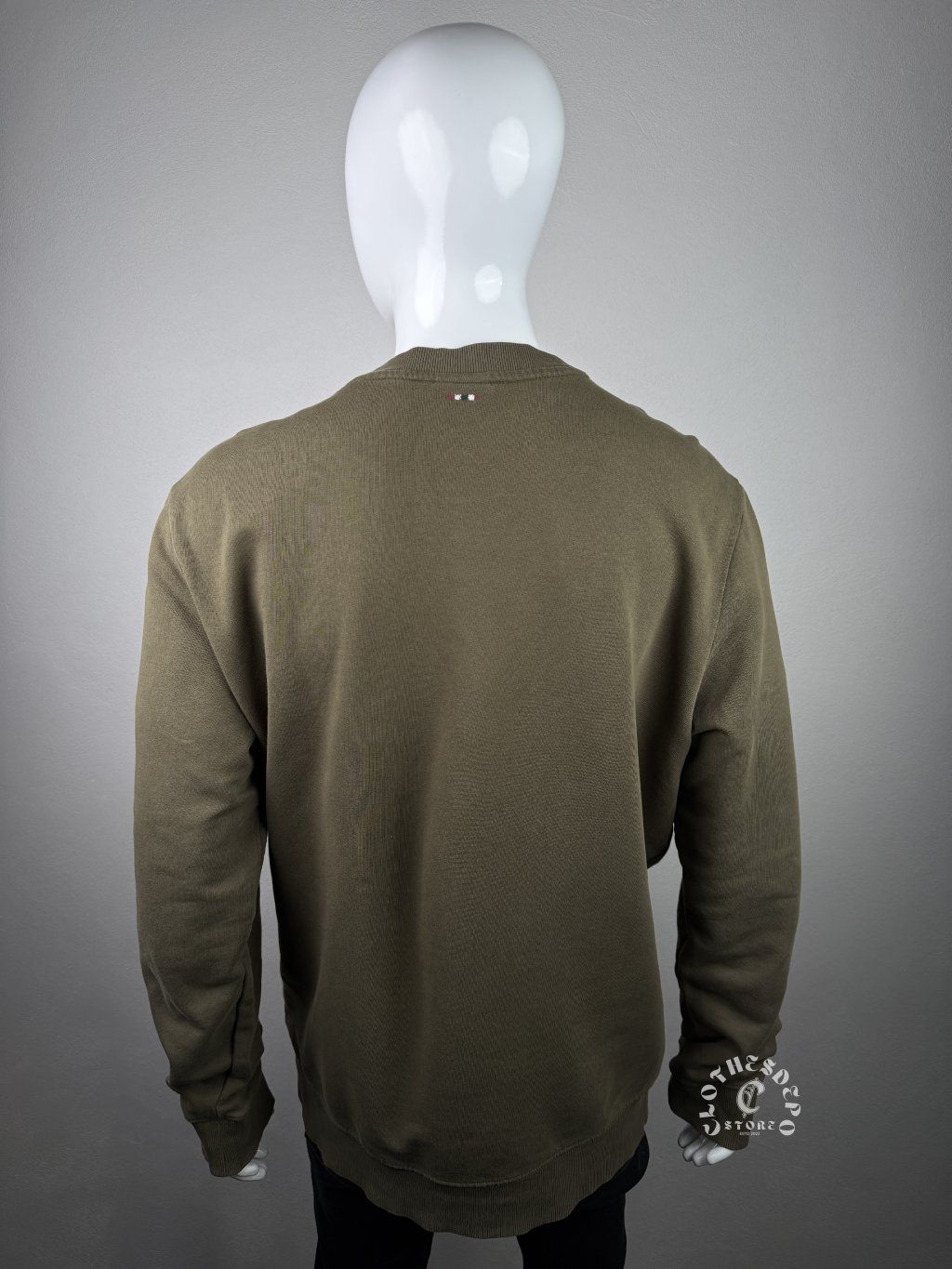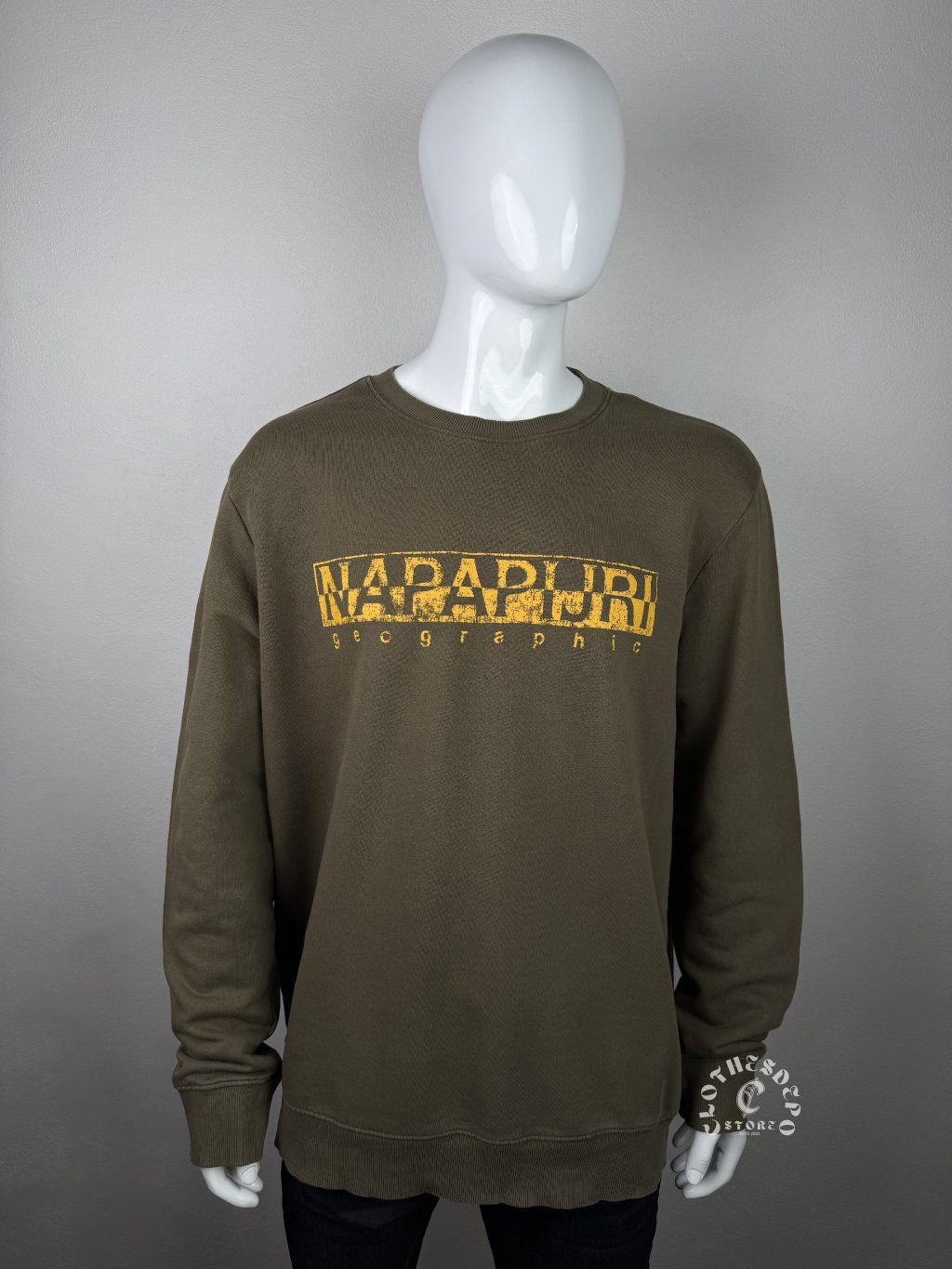Štýlová pánska mikina Napapijri Geographic v modernom outdoor-casual štýle. Model je vyhotovený v khaki / olivovej farbe s výrazným žltým logom „NAPAPIJRI geographic“ na hrudi, ktoré dodáva mikine charakteristický vzhľad značky.