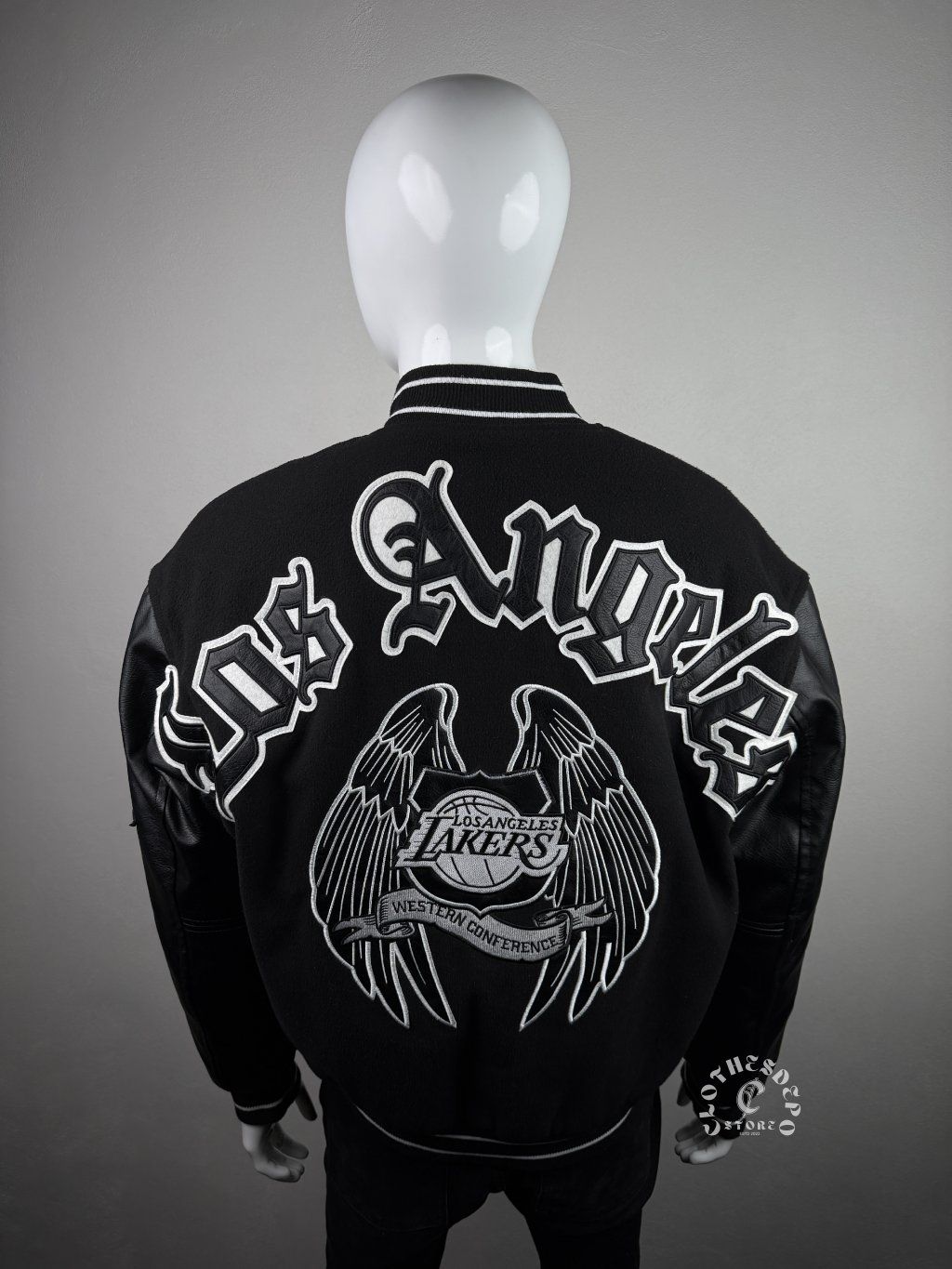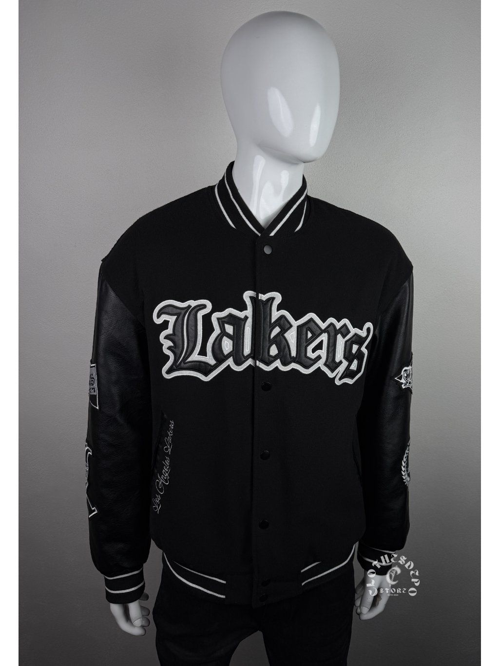 Štýlová varsity bunda v čierno-bielom prevedení s výrazným „Lakers“ nápisom na prednej strane. Zadná časť obsahuje veľký detailný grafický motív s logom Los Angeles Lakers a krídlami, čo robí z tohto kúsku výrazný statement piece.