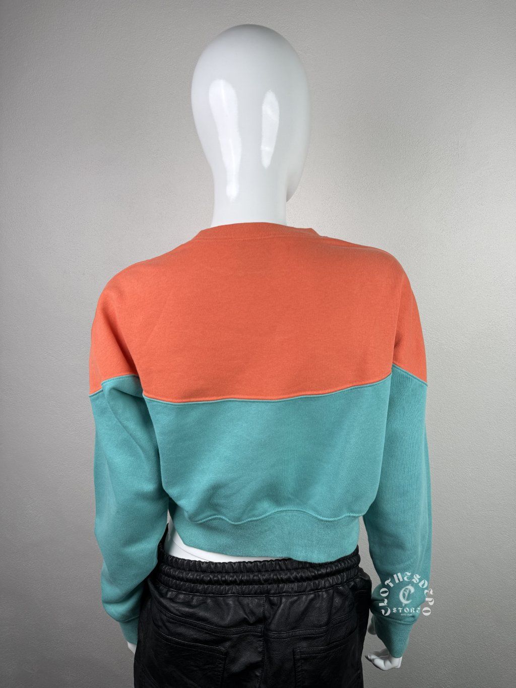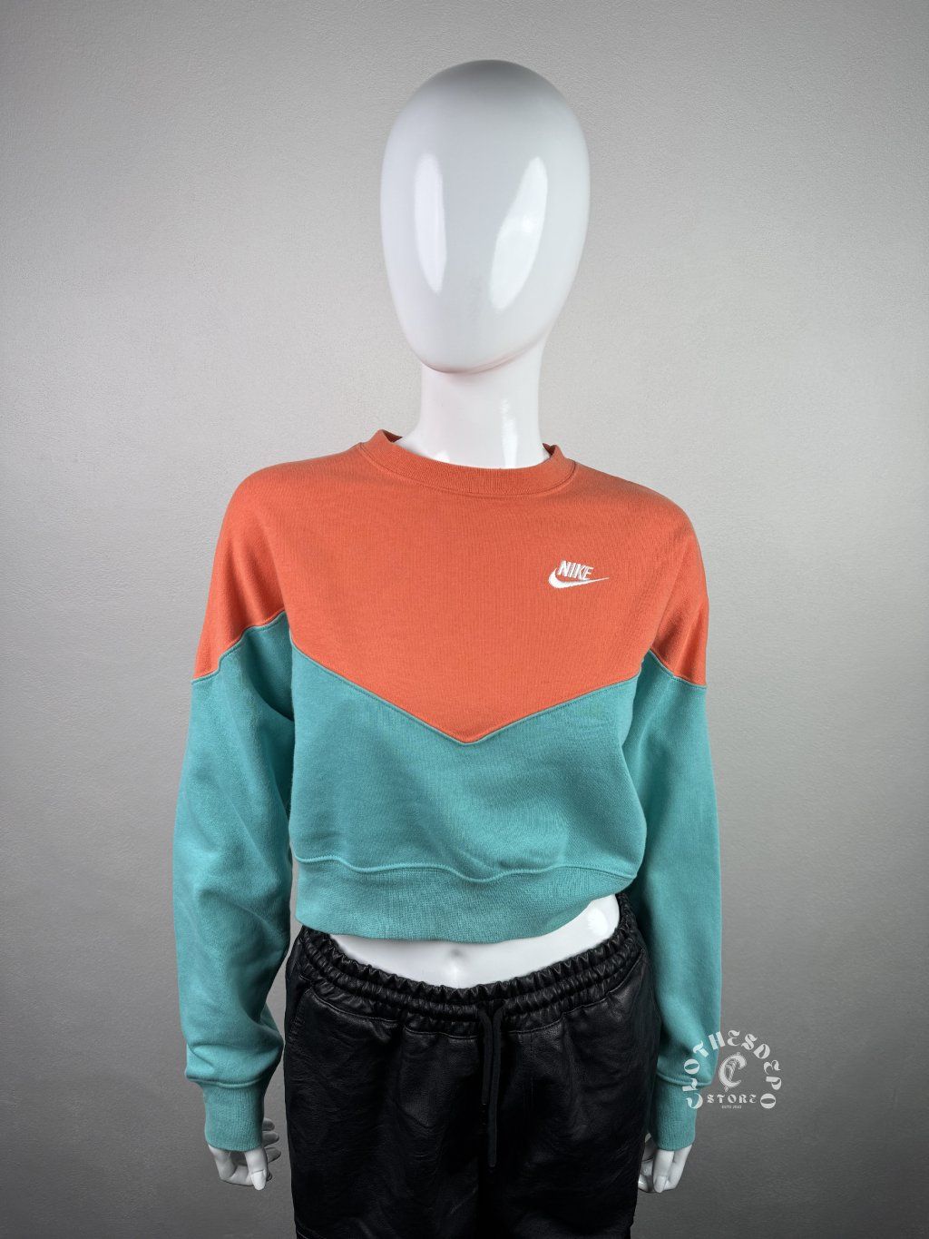 Moderná dámska cropped mikina Nike v štýlovom colorblock dizajne je ideálny kúsok pre športový aj streetwear outfit. Kombinácia výraznej oranžovej a tyrkysovej farby vytvára dynamický vzhľad, ktorý okamžite upúta pozornosť.