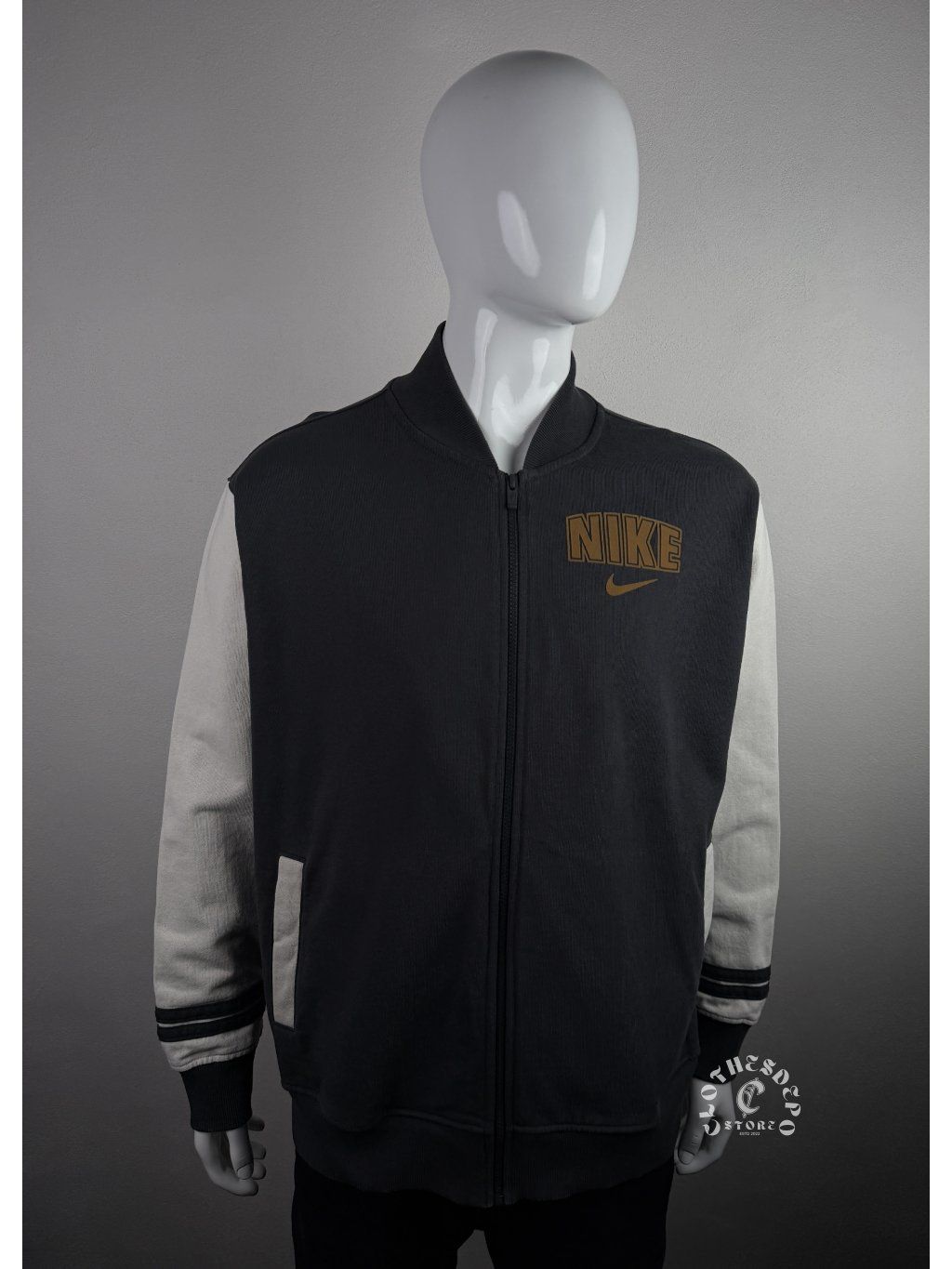 Športovo-streetwear Nike varsity bunda, ktorá kombinuje klasický college štýl s moderným dizajnom značky Nike. Bunda má tmavosivú hlavnú časť a kontrastné svetlosivé rukávy, čo vytvára ikonický varsity vzhľad.