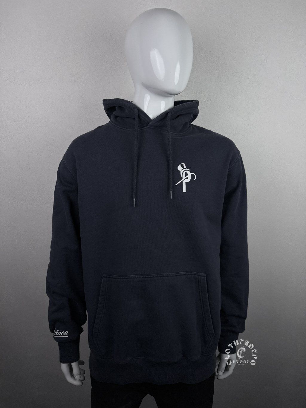 Štýlová mikina s kapucňou od značky Palace Skateboards v tmavomodrej (navy) farbe. Minimalistický dizajn dopĺňa decentné logo na hrudi a ikonický branding značky, ktorá patrí medzi top streetwear brandy.