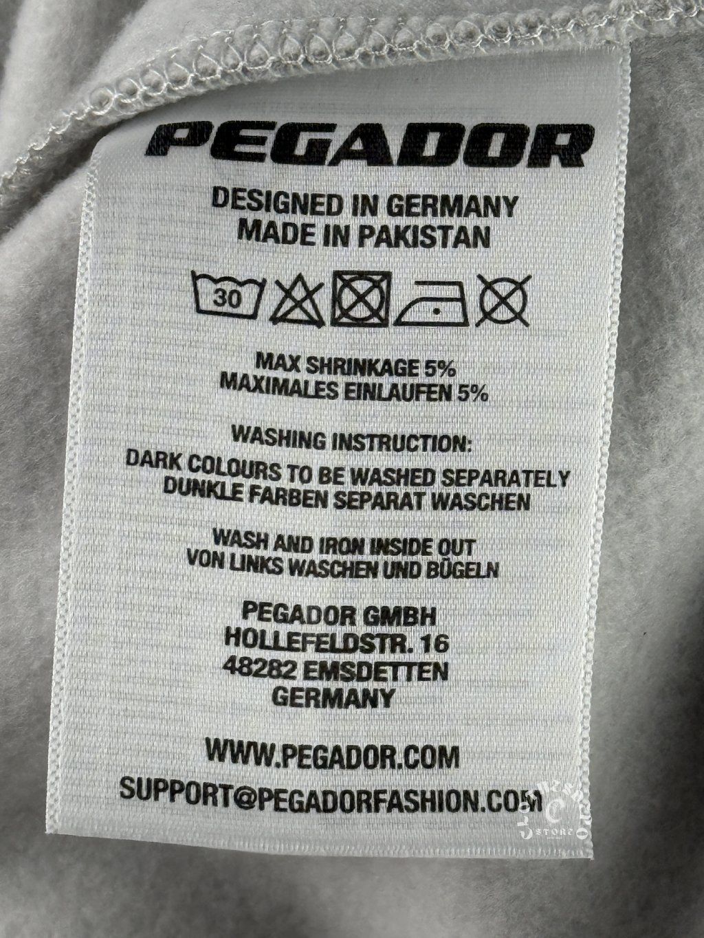 Mikina je navrhnutá v Nemecku a vyrobená v Pakistane, čo je typické pre značku Pegador, ktorá sa zameriava na kvalitné materiály a jednoduchý dizajn.
