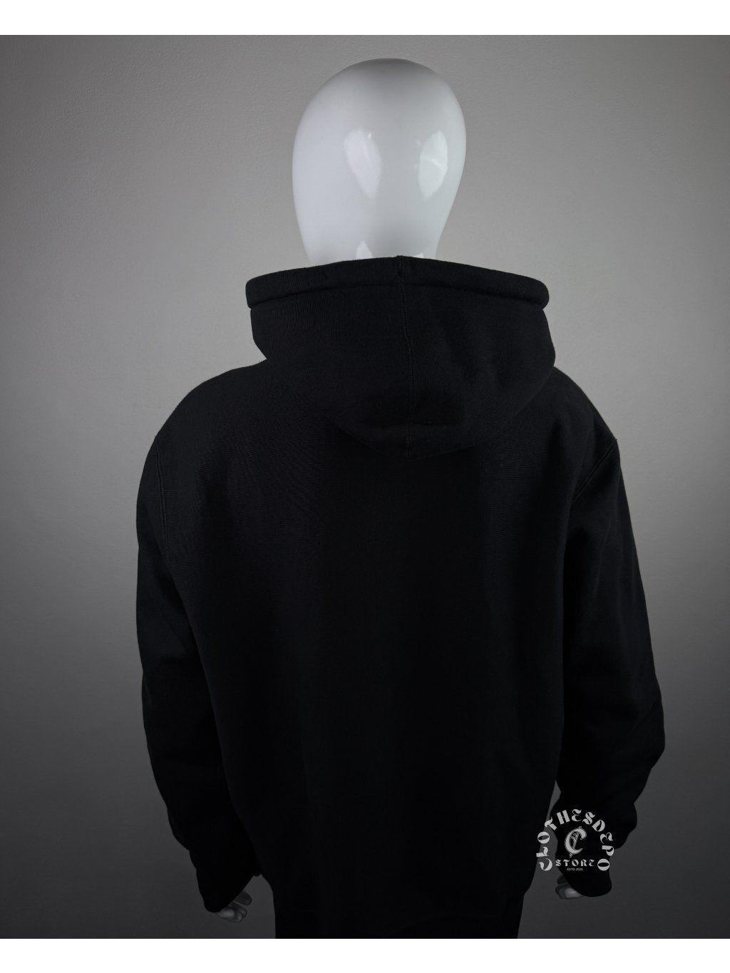 Čierna mikina s kapucňou s výrazným červeným logom „PLEASURES“ na hrudi. Minimalistický, ale silný dizajn typický pre túto značku.