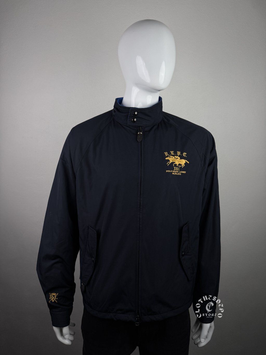 Elegantný tmavomodrý (navy) odtieň dopĺňa výrazná zlatá výšivka jazdcov na hrudi spolu s detailným brandingom „R.L.P.C.“. Bunda pôsobí luxusne, no zároveň športovo – ideálna kombinácia na každodenné nosenie aj smart-casual outfit.