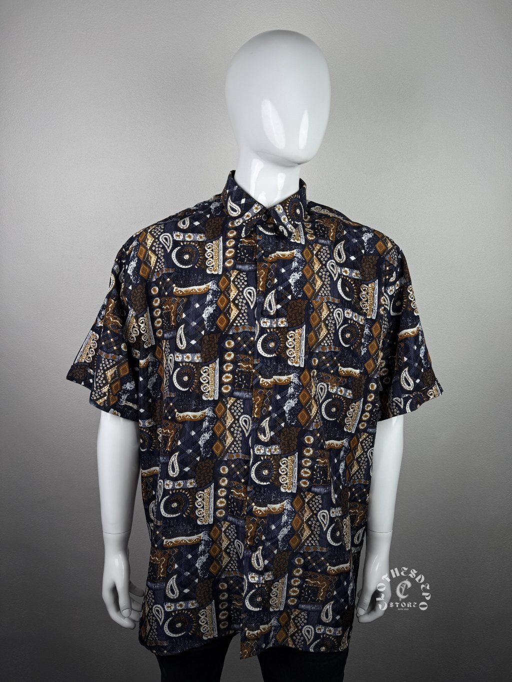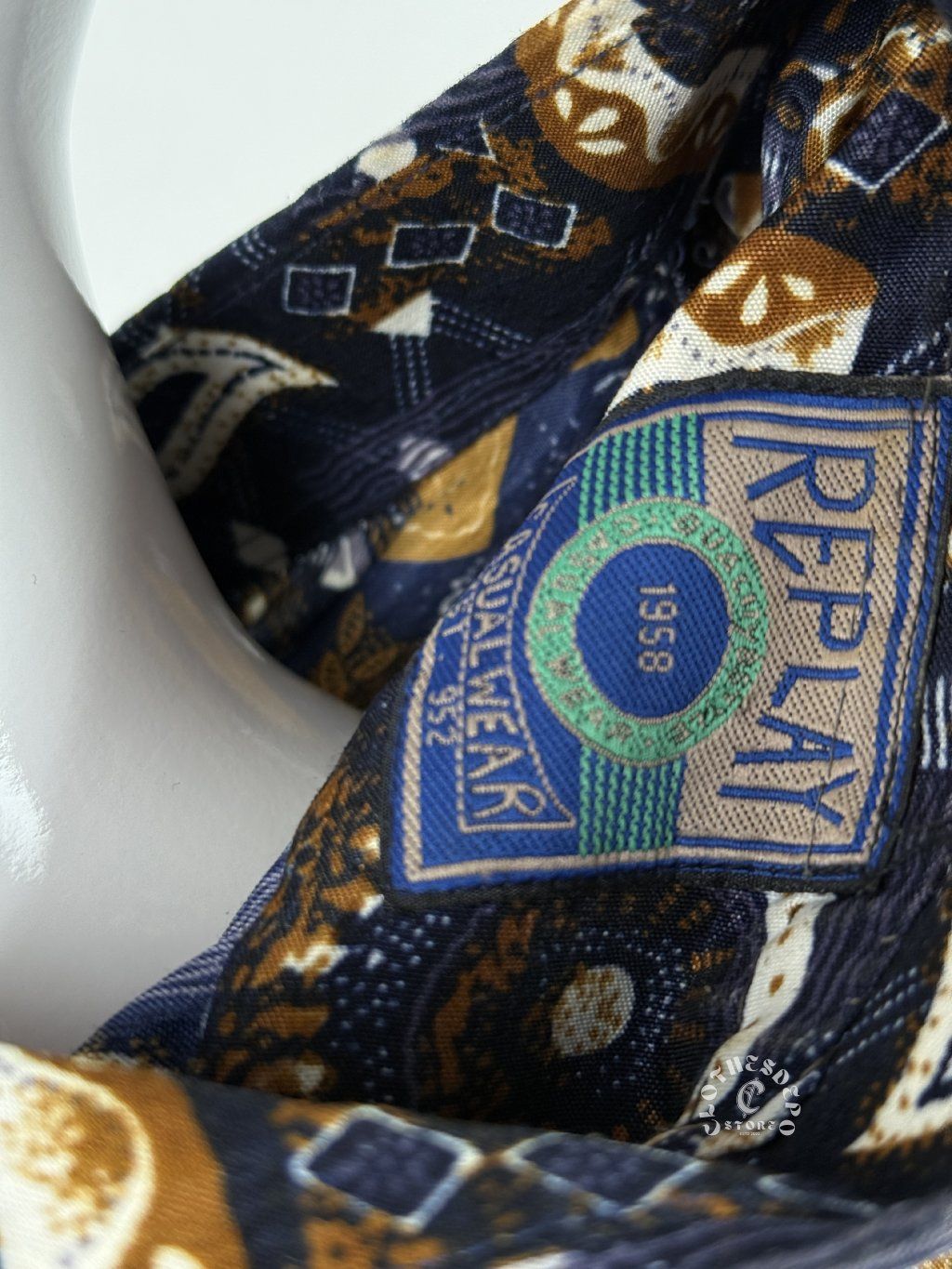 Štýlová pánska košeľa značky Replay s výrazným retro vzorom v tmavomodrej, hnedej a béžovej kombinácii. Model zaujme originálnou grafikou s paisley motívmi, geometrickými prvkami a ornamentálnymi detailmi, ktoré vytvárajú výrazný 90’s vintage look.