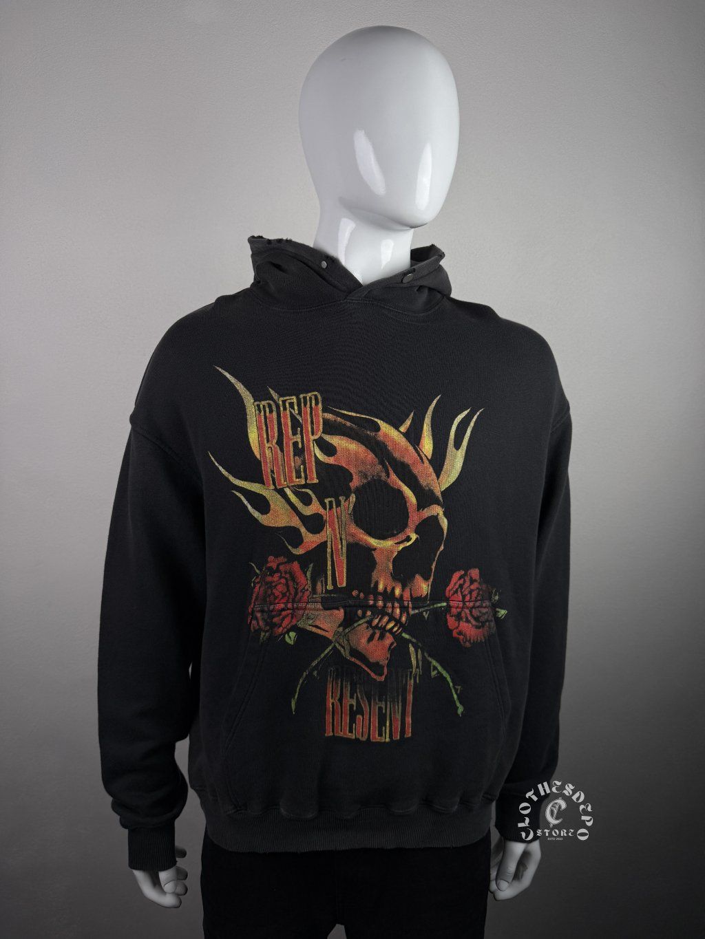 Tento model vychádza z estetiky vintage rockových merch mikín z 80. rokov. Predná strana obsahuje veľkú grafiku lebky s plameňmi a ružami, doplnenú typografiou “REP N RESENT”, ktorá odkazuje na temnú rockovú a metalovú estetiku. Grafika je spracovaná v štýle starých koncertných tričiek, čo dodáva mikine autentický vintage vibe.