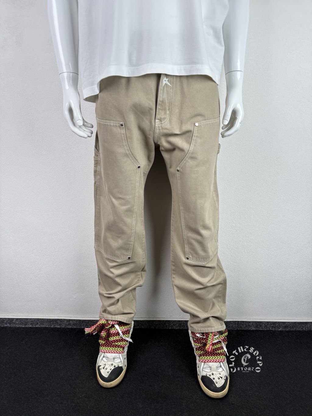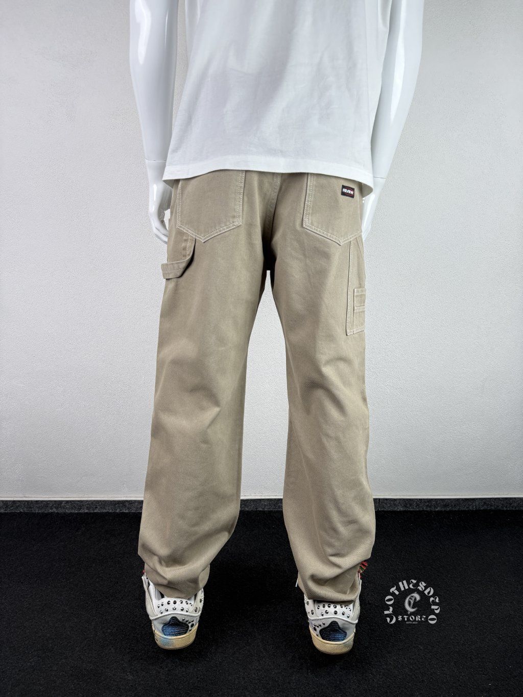 Moderné cargo nohavice značky Review v béžovej farbe, ktoré kombinujú streetwear štýl s praktickými prvkami. Minimalistický dizajn dopĺňajú výrazné utility detaily ako zosilnené kolenné panely a viacero vreciek.