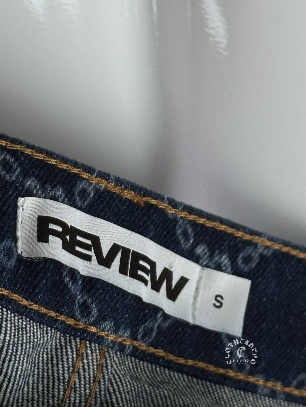 Review denim kraťasy s monogram vzorom a výrazným nápisom. Tmavý denim, streetwear štýl a unikátny dizajn pre letné outfity.