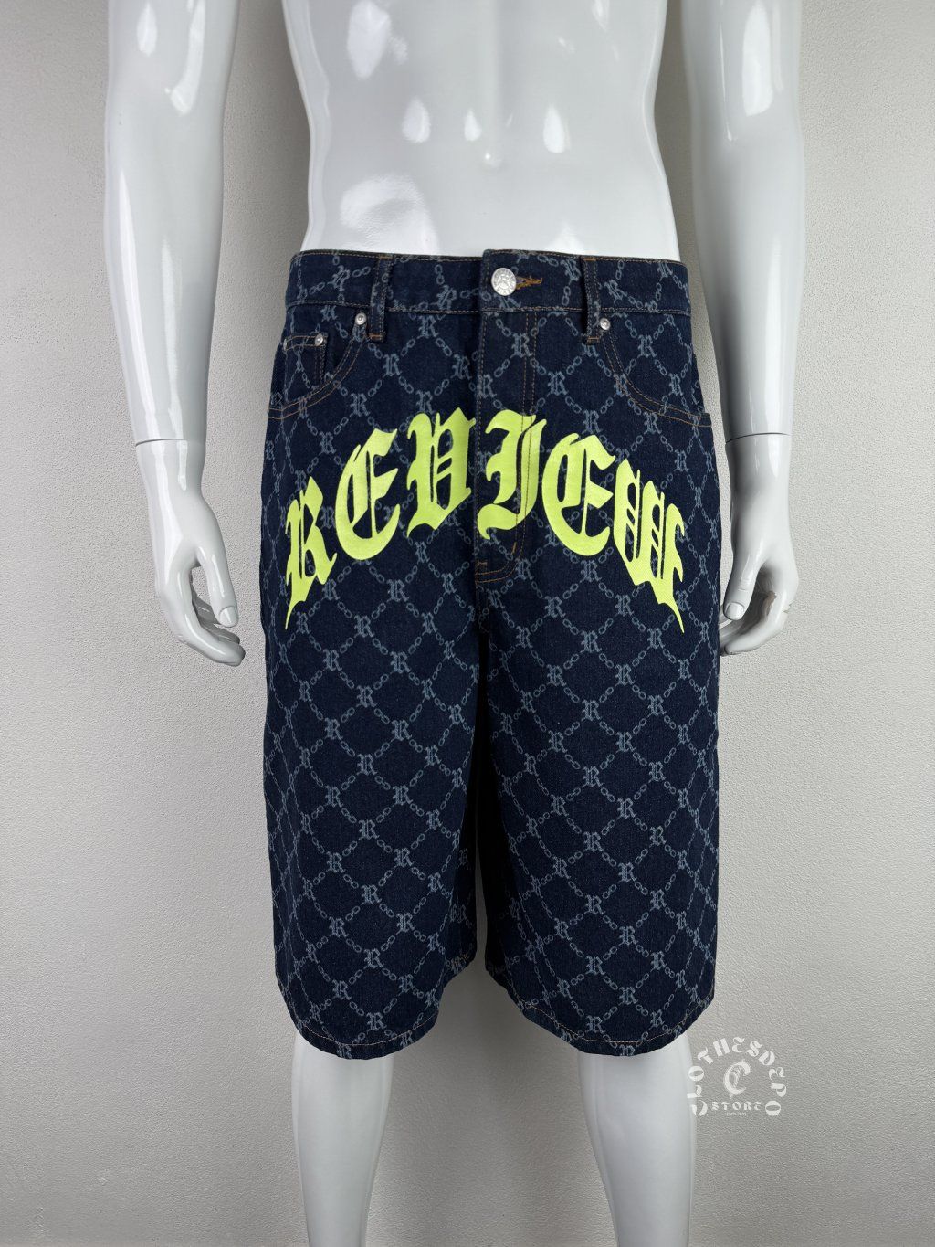 Výrazné rifľové kraťasy od značky Review, ktoré okamžite zaujmú svojím unikátnym all-over monogram vzorom a veľkým „REVIEW“ nápisom v kontrastnej neónovej farbe.