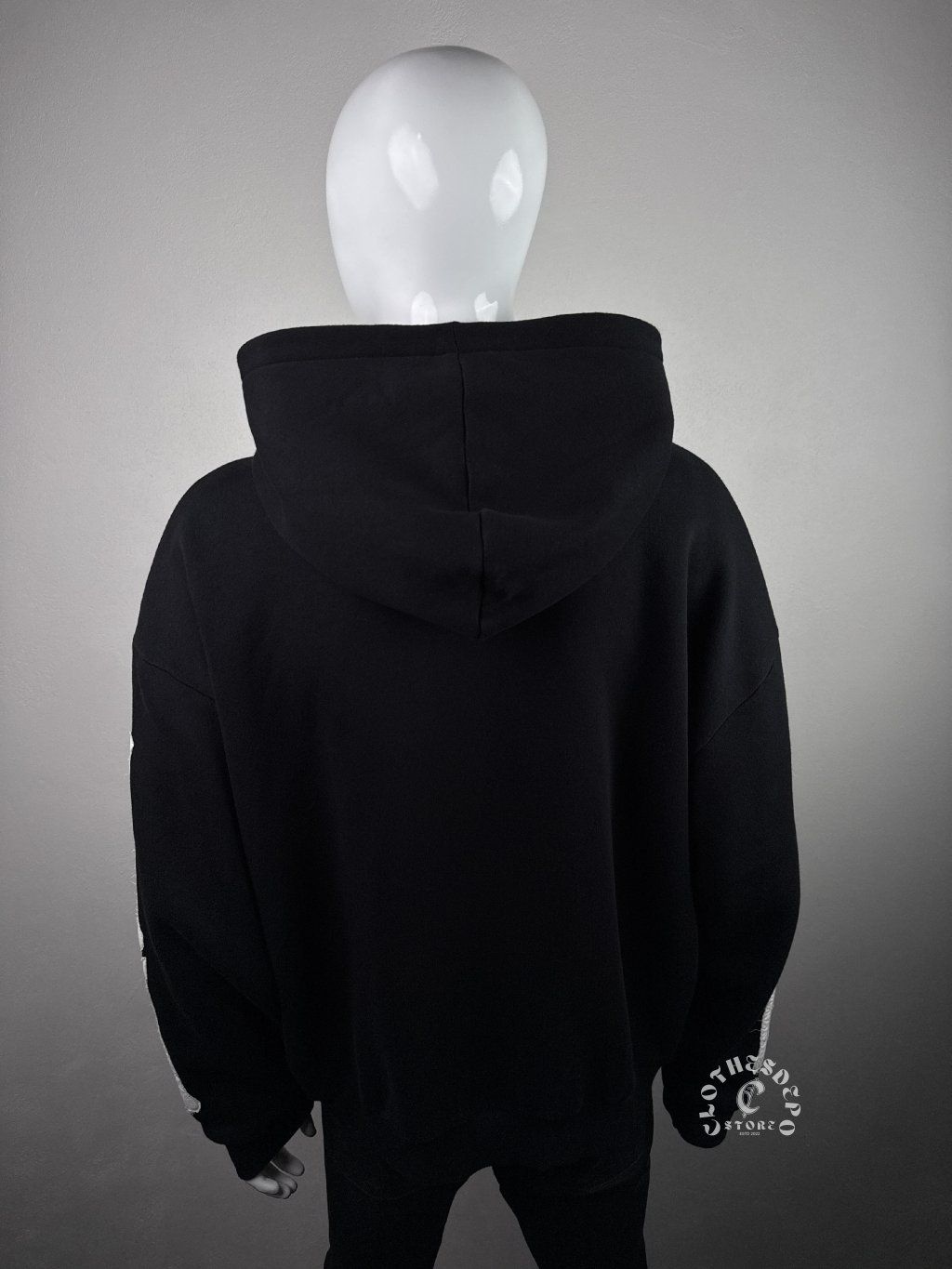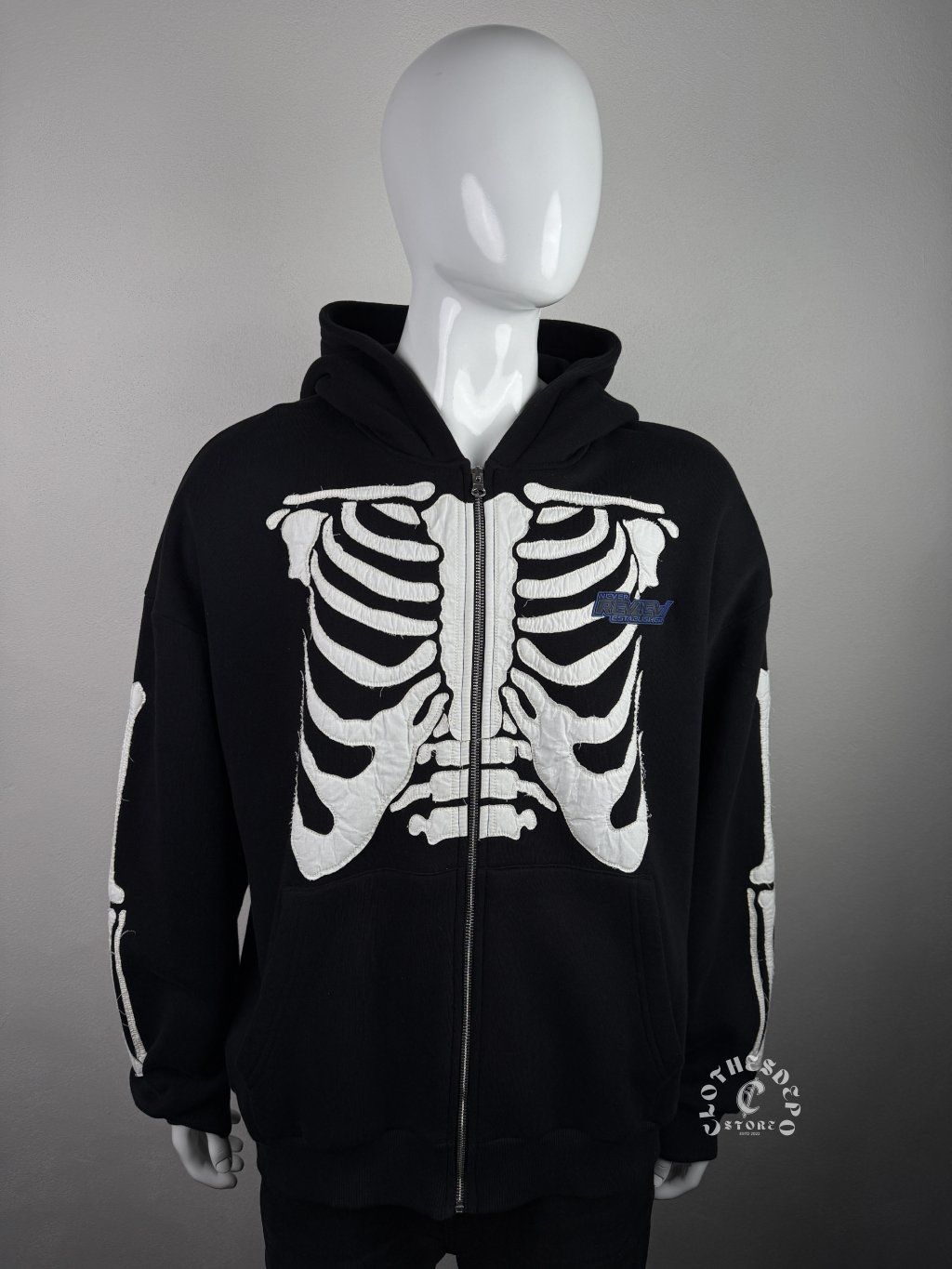Prednú časť mikiny dominuje veľká plastická aplikácia kostry (skeleton ribs), ktorá prechádza cez hrudník a vytvára unikátny vizuálny efekt. Kostra pokračuje aj na rukávoch, čo robí dizajn ešte výraznejším a typickým pre alternatívny streetwear štýl.