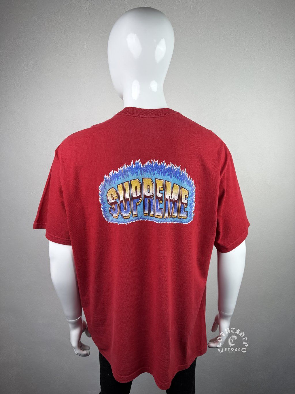 Supreme tričko v červenej farbe s výrazným a ikonickým dizajnom. Na zadnej strane sa nachádza veľký „SUPREME“ print s flame efektom, ktorý dodáva kúsku silný streetwear vibe a robí z neho výrazný kúsok do každého outfitu. Predná strana je doplnená o menšie logo na hrudi, čo pôsobí minimalisticky a zároveň štýlovo.