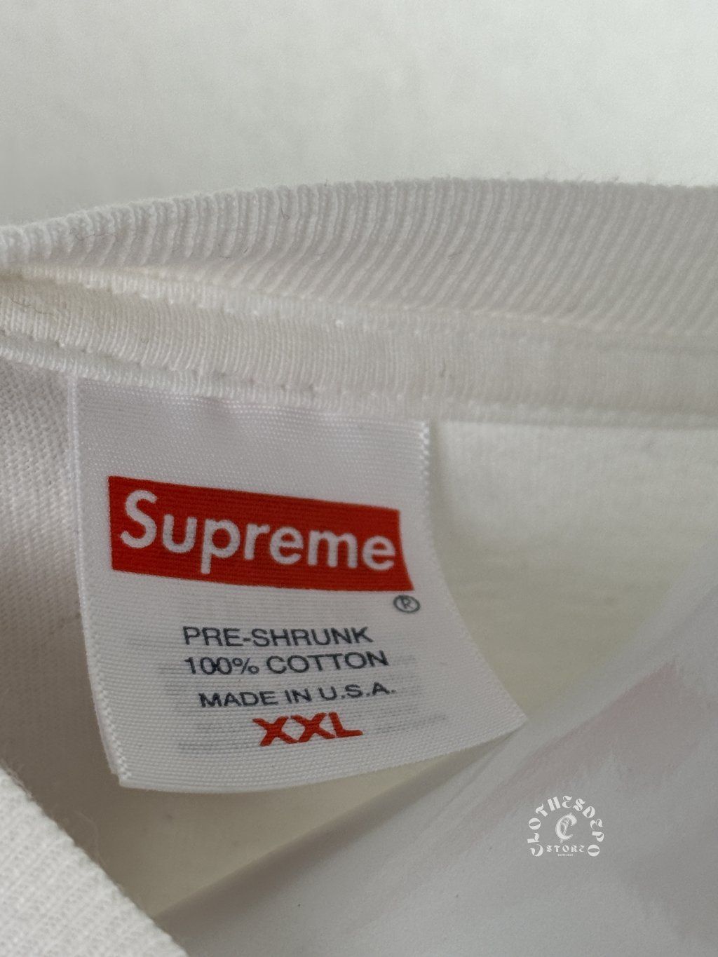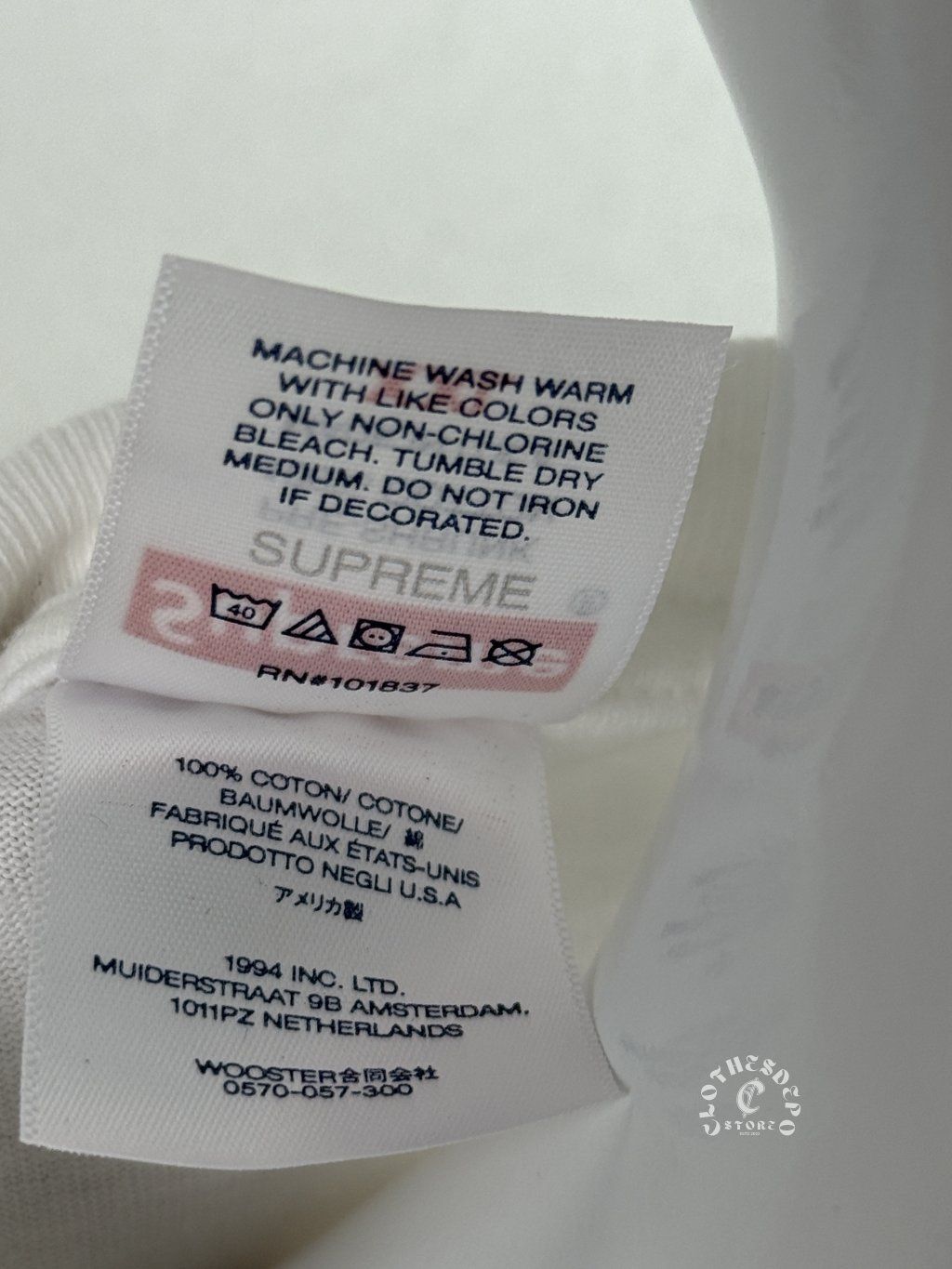 Materiál je označený ako pre-shrunk, čo znamená, že bol predpraný, aby sa minimalizovalo zrážanie po praní. Tričko je zároveň vyrobené v USA, čo je typické pre staršie kolekcie Supreme.