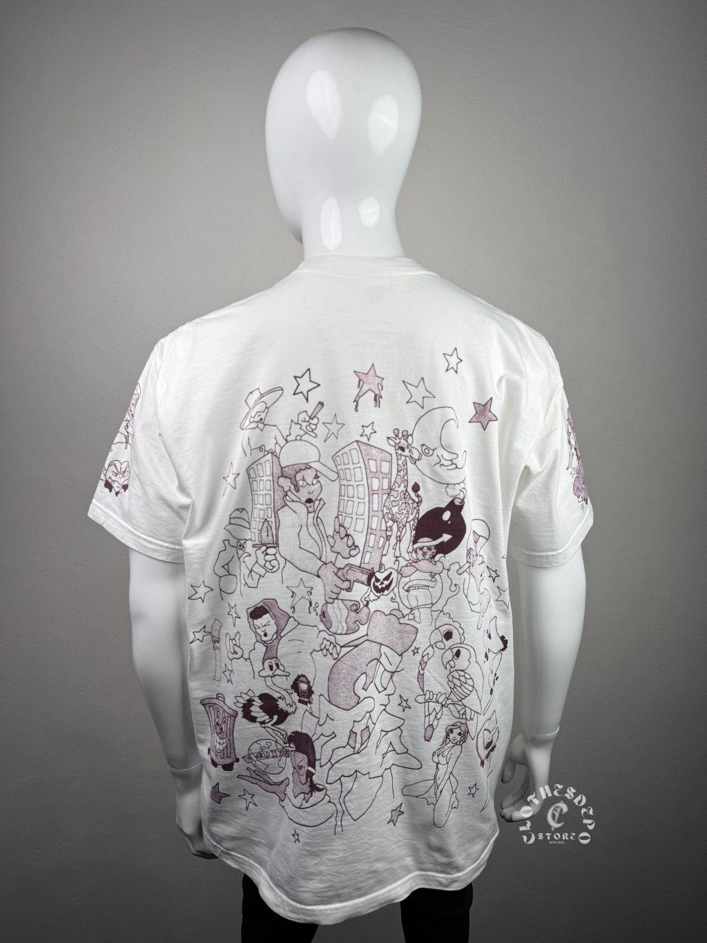 Najvýraznejším prvkom je veľká umelecká grafika na prednej aj zadnej strane, ktorá zobrazuje rôzne ilustrácie postáv, mestských motívov a street art prvkov. Dizajn vytvára vizuálne výrazný streetwear look a robí z trička zaujímavý statement piece.