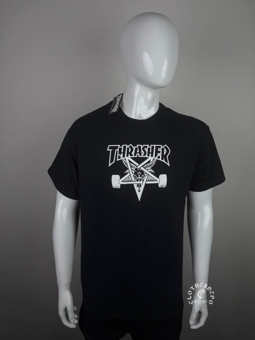 Originálne tričko Thrasher v čiernom prevedení s výraznou grafikou na hrudi. Dominantným prvkom je ikonický nápis Thrasher doplnený o grafiku s motívom skateboardu a pentagramu (Skate Goat dizajn), ktorá je typická pre rebelantský a autentický skate štýl značky.