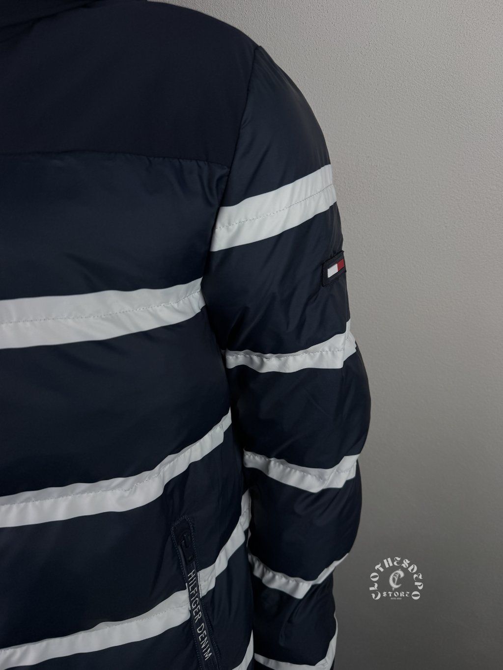 Pánska bunda Tommy Hilfiger Denim – tmavomodrá puffer bunda s pruhmi