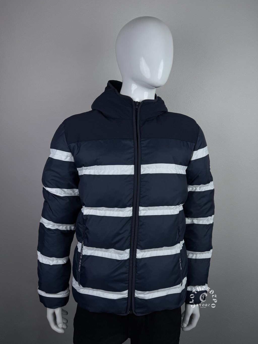 Bunda má klasický puffer dizajn, ktorý poskytuje výbornú tepelnú izoláciu a zároveň zostáva ľahký a pohodlný na každodenné nosenie. Tmavomodrá farba je doplnená výraznými bielymi horizontálnymi pruhmi, ktoré dodávajú bunde športový a moderný vzhľad.