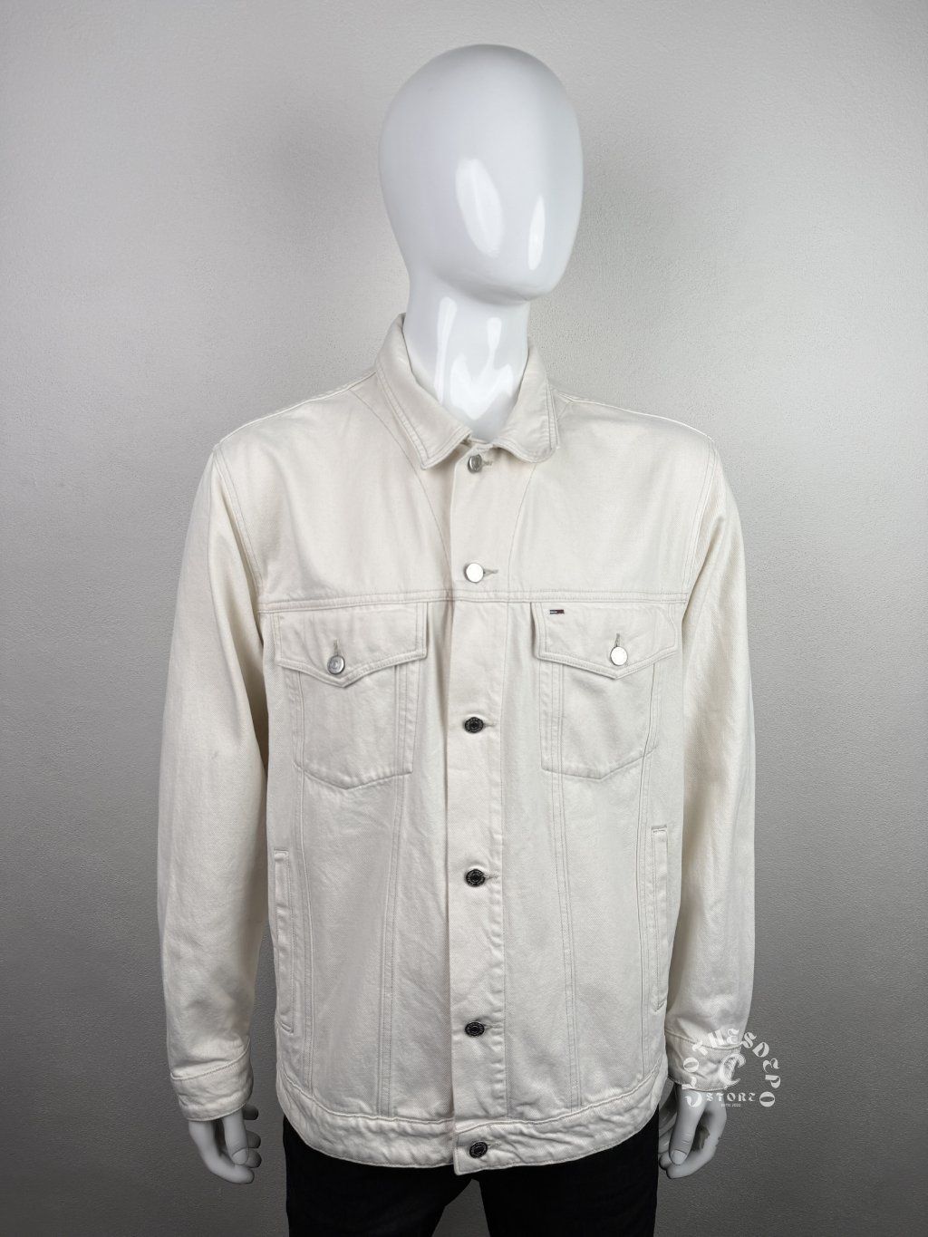 Štýlová pánska denim bunda od značky Tommy Jeans v nadčasovej krémovej (off-white) farbe. Klasický „trucker“ strih s moderným streetwear vibe-om robí z tohto kúsku ideálnu voľbu na každodenné nosenie.