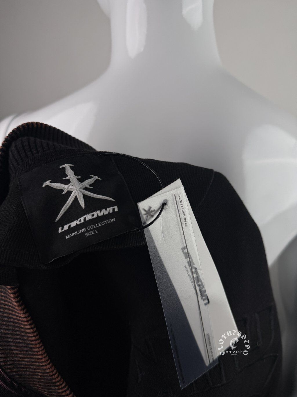 Prednú časť bundy zdobí veľké plastické logo Unknown London, ktoré je aplikované v čiernom reliéfnom prevedení. Rovnaký výrazný branding sa nachádza aj na zadnej strane bundy, čím vytvára silný vizuálny prvok typický pre kolekcie tejto značky.